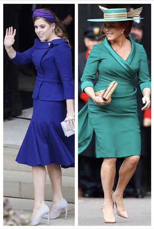 Partiamo dalle più vicine: Kate in Alexander McQueen (come sempre!) castissima in glicine e forse si poteva fare qualcosa di più; Megan in Givenchy, blu classico; Pippa in verde smeraldo di Emilia Wickstead e con panza di 8 mesi per la quale poteva scegliere un altro modello; sorella Beatrice in bluette di Ralph & Russo e mamma Fergie in verde con un vestito non male rovinato da un inguardabile cappello, di Jess Collett Milliner.